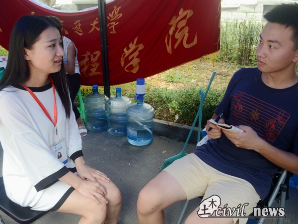 接着,记者希望付老师能用一个关键词来形容这三天的迎新工作。“热情,”辅导员沉思了一会儿,“我用这个词不仅是因为迎新时炎热的天气,还因为这些天来迎新点处工作人员的工作态度。虽然这几天的工作并不是尽善尽美,但他们一直都很努力,很努力地对待工作,很热情地对待新生。”付老师在叙述时还回忆了助辅们在烈日下挥汗如雨、衬衣全部湿透的画面,细细想来,“热情”一词的确极其贴合本次迎新的场景。