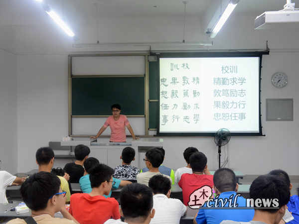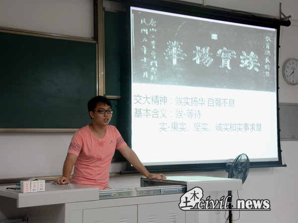 的官方微信码,希望同学们能通过网络方式多多了解学院大事。随后,他陆续和同学们讲解了交大的校徽、校歌、校训以及双严传统,让同学们对交大的概况有初步了解。他还尤其希望同学们能够时刻铭记“竢实扬华,自强不息”的交大精神,并对这句话做了详细的阐释。