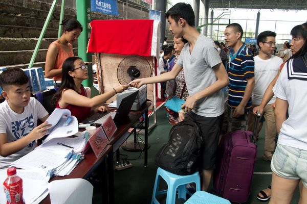 的志愿者们一直都守候在高铁站和火车站耐心的等待并迎接新生的到来,同时并引导即将入学的新生和陪同报道的家长们乘坐校车前往学校。这些志愿者们在工作耐心细致,积极为大一新生解答入学疑惑,帮助新生搬运行李,引导大一新生完成入学手续办理整的个过程,以此保证他们顺利报到。