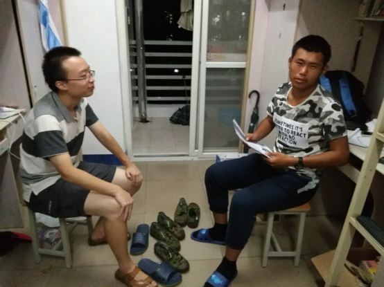 当晚9点半,活动正式开始。每位党员都进入到各自分配对接的寝室里,与大一新生们相互认识,答疑解惑。支部书记谭因军负责整体的统筹协调,他去了5号楼新生所在的每间寝室,关切地询问同学们在学习和生活等各方面遇到的困难,并详细说明了班级团结的重要性。同时,也向新生询问入党意向,向有意入党的同学,强调入党积极性、介绍入党的注意事项。