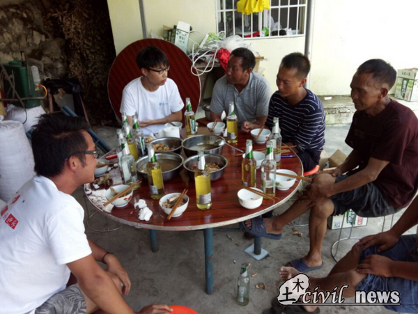 到了中午,村民委员会主任及书记等人充分体现了彝族人热情好客的特点,坚持要志愿者们品尝彝族特色,并且告诉他们,在彝族传统中,有客人来不能以寻常的菜肴招待,否则就是对客人的不礼貌,同时一定要有酒有歌才算招待客人。志愿者们也就接受了村民的款待。