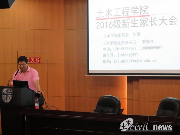 的历史沉淀、辉煌成就、杰出人物以及师资力量四个方面,为大家翔实地介绍了这个令无数交大人为之骄傲的学院。幽默的话语穿插着真实案例,李书记用自己独特的风格带领大家敲开了土木的大门,让同学以及家长对学院有了一定的了解。