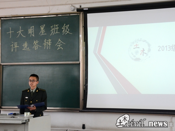 的15个提名班级代表便开始轮流上台发言。率先上台的国防生代表张润泽同学用一面满是旌旗与奖状的荣誉墙惊艳全场。随后13级2班的代表吴桐同学更是用全院党员率第一,文明寝室率第一,奖学金率第二的数据证明了自己所在集体不容置疑的优秀。14级16班的代表郭文琦同学不仅列出本班优秀的成绩排名,还通过在合唱比赛、团日活动等文体活动中的积极表现说明了16班强大的综合实力。而来自14级15班的滕茂科同学则用一幅幅照片反映出同学们一起做趣味游戏的场景,使他们的集体更具“家庭氛围”。