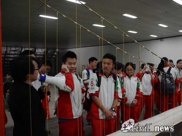 从国工室出来后,同学们来到了风工程实验室。作为亚洲最大的民用风洞实验室,里面正摆放着一座大桥的模型,实验室的工作人员向同学们介绍了风洞的组成和作用,以及实验室的研究成果。参观风洞之后是一次模型的制作比赛,在比赛中大家也是各尽所能,希望可以得到更好的结果。