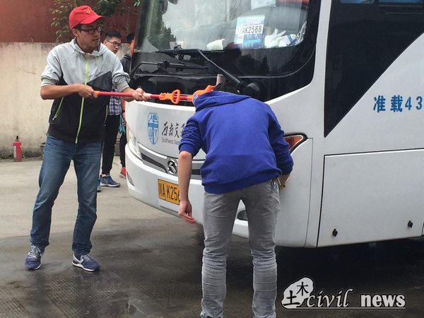 如果校车灰尘更多的话,上述的步骤还有再重复一遍。志愿者们分工有序,玻璃、车身、车内、倒水各司其职,工作起来相当的有效率,洗车师傅开始在旁边给我们指导,看到我们自己完成洗车后赞不绝口。忙碌的工作一直持续到下午4:30,在九里金工实习的机械学院同学们也陆续返校,看到自己乘坐的校车是我们刚刚清洗的,对此也表现了赞赏之情。看着一辆辆“风尘仆仆”的校车在自己的劳动下变的焕然一新,大家心里都是满满的自豪与高兴。本次活动共清洗了3辆校车,在活动的尾声,我们在新洗干净的车前合影留念,司机师傅特许我们的志愿者提前上车,坐在自己亲手清洗里的校车中回到犀浦,洋溢的幸福是难以用文字表达的。