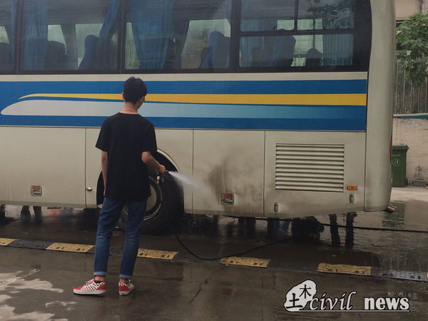 到达校车站,与管理人员交谈过后,志愿者们就拿出工具,盛好清水,向着刚进站的一辆校车展开攻势。抹布、玻璃刮、高压水枪、清洗液……清洗工具一应俱全。清洗校车分两步,第一步先是要用高压水枪冲去灰尘,打湿车身和玻璃。这个过程中高压水枪喷出的水幕经常会弄湿大意的志愿者,“没事,就当是洗了次鞋吧”,一位不慎被打湿鞋子的志愿者如是回答。第二步则要志愿者们运用玻璃刮、抹布仔仔细细地擦拭车身了,车灯、玻璃、车牌等部分尤其要认真擦洗,就连轮胎的轮盘挡圈部分他们也不放过,为了校庆,志愿者们十分用心。值得一提的是,擦拭过程中一名志愿者使用抹布不小心手指被车身划伤,迅速就有志愿者带他到候车场地休息并且用准备好的创口贴包扎伤口,只休息了一会儿他又拿起了玻璃刮,“不碰水我也可以继续干”。
