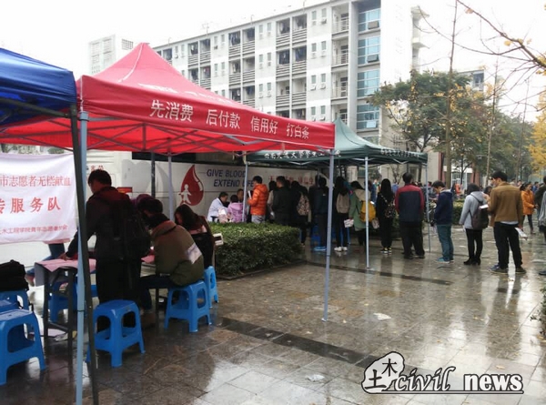 在活动当天的献血现场,经过校团委、保卫处的批准,无偿献血志愿服务宣传队的成员协助成都市血液中心的工作人员对献血的同学进行了一系列检查工作。前来报名的同学很多,不仅有我们的学生,食堂师傅也参与到了我们的献血队伍。12月3日当天活动更是出现了一个意外的惊喜,感动中国人物郭明义来到了我们南区的活动现场支持我们的活动。他们表现出了自己的人道主义风范,促进了社会主义物质文明和精神文明建设。更表现了当代大学生的爱心风采和团结奋斗的力量。他们还不时地向血液中心工作人员询问关于献血的有关规则和献血小知识。这种崇高的爱心品质值得每一个年青人发扬。刚过半个小时,献血的同学已经排成了长长的队伍,这时还有陆陆续续的同学期盼参与到这次活动中来。