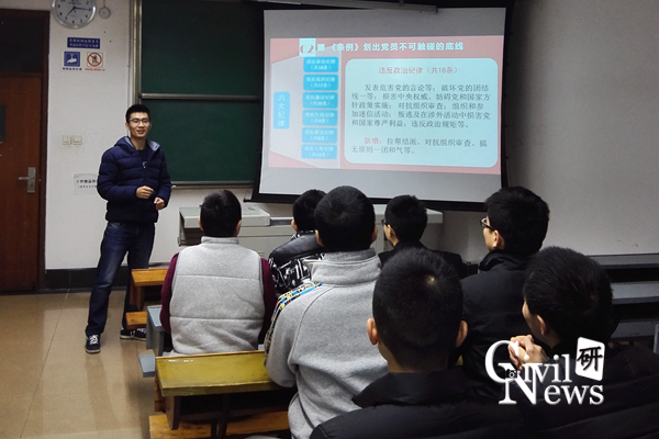 活动以党支部各成员一起观看学习PPT为主。学习内容以这六部分展开:“《准则》是第一部基础性法规《条例》”、“划出党员不可触碰的底线 ”、“违反《条例》后果更加严重、对号入座,不再包括贪污贿赂行为”、“正确理解几条关注的规定”、“启示与思考”。