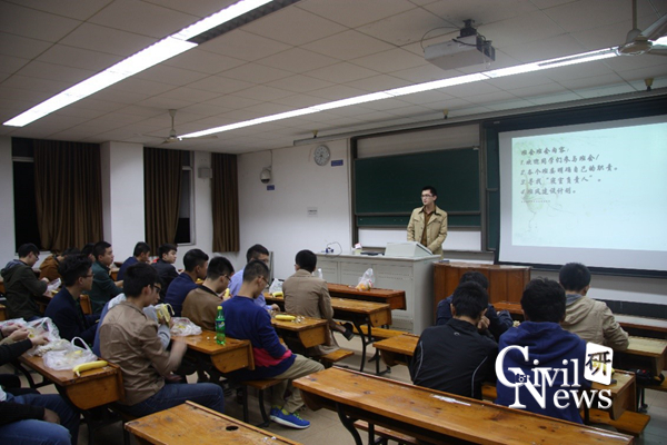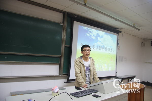 班会开始,班长段东亚首先上台,他说明了此次开展班会活动的目的、安排,希望借此次班会活动总结开学这段时间班级内部总体的情况、遇到的问题以及提出更进一步的期望。他讲到,研究生学习和生活过程中,平时最熟悉的是一个工作室和一个寝室的同学,希望同学们能扩大圈子,更多的关心和帮助一个班级一个专业的同学,引起了同学们的思考。