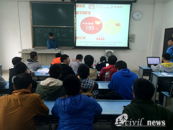 前几个小组以PPT的形式,将他们的学习成果展示出来,同时每个小组还有一个代表来对内容进行讲解,与大家交流。在“创新发展”这一当下与大学生关系紧密的关键词上,大家明显表现出了浓厚的兴趣和讨论的热情;在“二孩政策”“反腐败斗争”这些一直受普通百姓关注的话题上,大家也有着许多自己的想法与他人交流。之后,第六组一反常规,改用书面形式进行展示,并用了许多发生在他们身边的故事作为例子,进行分析并佐证他们的观点。而最后的女生小组更是展示了她们活泼的一面,采用更富有新意的PPT来展示。在展示过程中,更是表达了对于当代青年发展的看法,将活动推向了高潮。