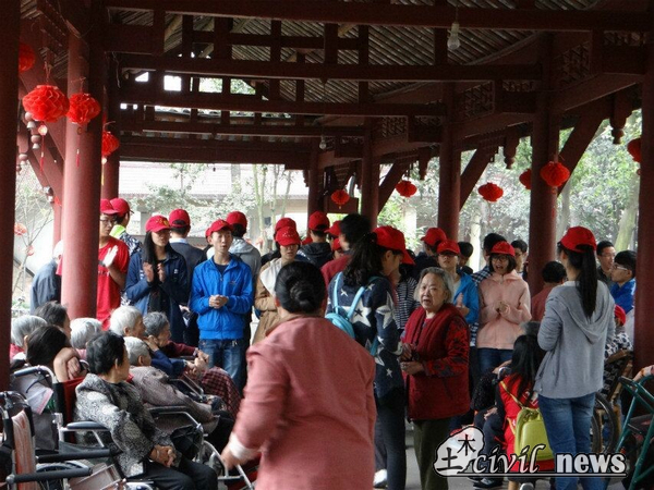 在老年公寓门口,志愿者们偶遇西华大学的20余位志愿者,通过交流协商,两校青协决定协同合作开展活动。志愿者们在明确职责分工、了解了注意事项之后进入了老年公寓。