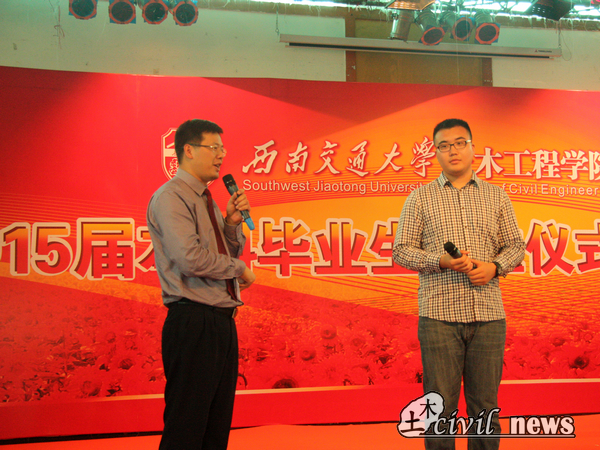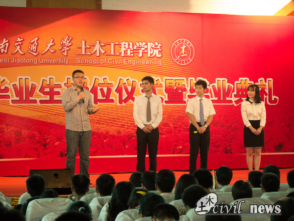 首先是侯文昂同学。他已经在美国读研半年,几天前特地辗转几次从美国飞回母校,参加毕业典礼。在李书记的提问下,侯文昂谈到了一件他在美国遇到的特别令他自豪的事情:在路基工程课上,他导师的ppt上用到的唯一一张中国的照片就是自己母校的研究成果,这让他因为看到母校、看到祖国逐渐走向世界前列而感到自豪。另外,侯文昂还说,在美国他一般凌晨两点回寝室休息,而美国同学却往往要学习到凌晨三点,他不得不佩服美国同学的学习精神。