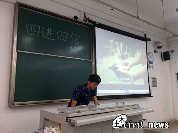 5月7日晚上7点整,2013级土木八班在X2428开展了名为“四进四信,做一个乐善好施的人”的主题团日活动。活动旨在向大家传递什么是“四进四信”,并通过播放泰国公益视频让大家从生活的小事中能更好的了解 “四进四信”。