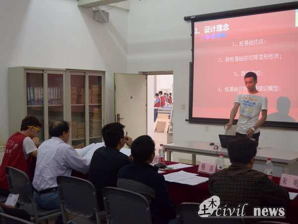 在工作人员的指引下,选手到达指定地点,经过评委老师对比赛内容的简单介绍,开始制作模型。竞赛的模型制作过程要求参赛队伍在指定时间内完成承台成型、基桩布桩、基桩与承台连接及群基桩制作的工作。现场评委在过道中观看选手们的表现。一小时后,各参赛队伍进入模型核查及加载环节。