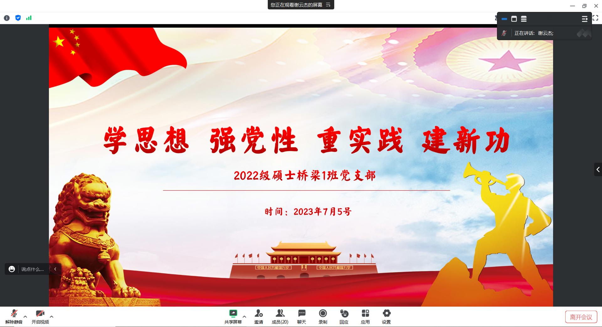 2023年7月5日晚上19:00,桥梁1班党支部开展了“学思想 强党性 重实践 建新功”读书交流会主题党日活动。本次活动由谢云杰同志主持,支部党员及部分积极分子参与。