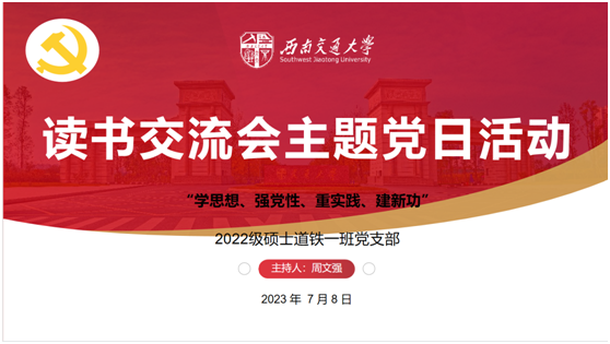为深入学习贯彻习近平新时代中国特色社会主义思想,持续引领党员们筑牢信仰之基、补足精神之钙、把稳思想之舵,2023年7月9日,2022级硕士道铁1班党支部在通过腾讯会议开展了“学思想、强党性、重实践、建新功”读书交流会主题党日活动,此次活动由刘延滨等5名同志领学述学,分享学习体会,其他同志谈感想、谈认识。