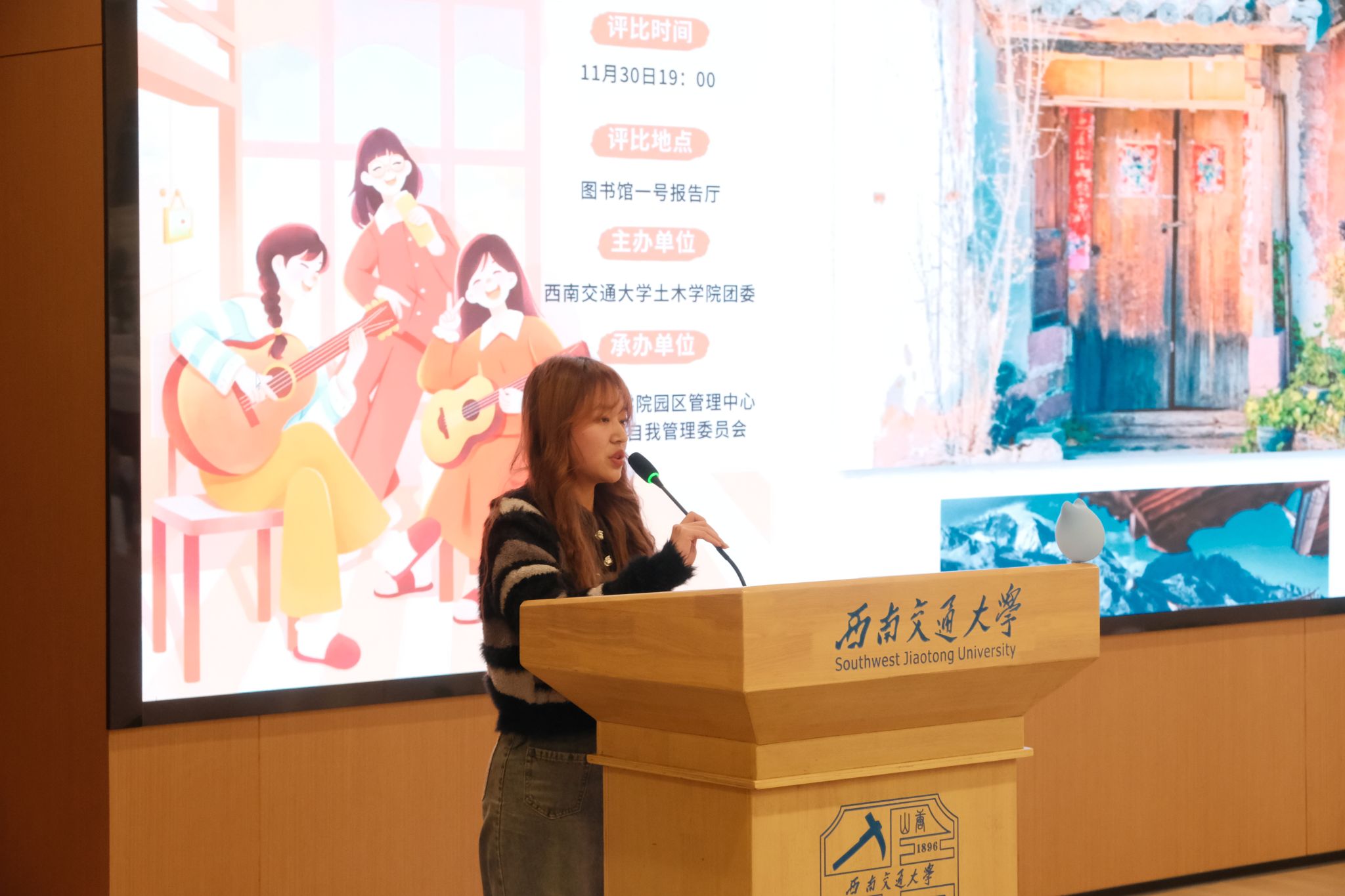 团委主办、土木园区管理中心承办了“小城风物”寝室装潢大赛决赛,11月30日晚七点,本次大赛在图书馆1号报告厅顺利举行。党委学生工作部宿舍园区学生管理科刘颖、罗邱、王一哲,色情短剧