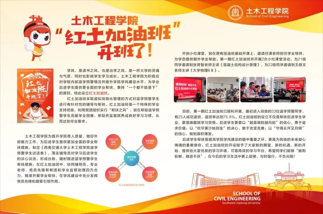 学院着重加强大一新生及退学预警学生学风监管与帮扶,特设红土加油班1班与2班。其中1班成员由一学期未到达15学分的大一学生组成,旨在提醒新生同学重视学业,帮助其尽早回到学习正轨;2班成员由本科阶段累计两学期未达到15学分、进入退学预警期的学生组成,旨在为这部分学生提供更全面的学业帮扶,帮助其克服学业困难。