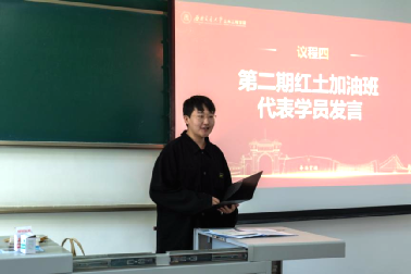 仪式第一项议程中,杨老师总结了第一期红土加油班取得的一些工作成效。她提到,在辅导员、专业老师、党员先锋帮帮团和学业监管助理四方合力,精准学业帮扶下,最初进入班级的33位退学预警同学,有25人成功退班,退班率达到 75.8%!杨老师鼓励在场第二期学员们千万不要灰心,希望他们斗志昂扬,带着为时不晚的冲劲,在这个班里好好学习。