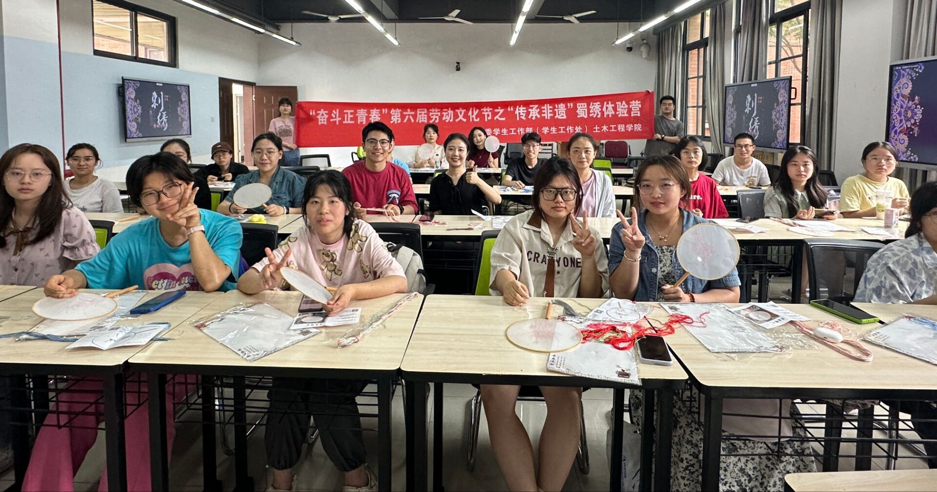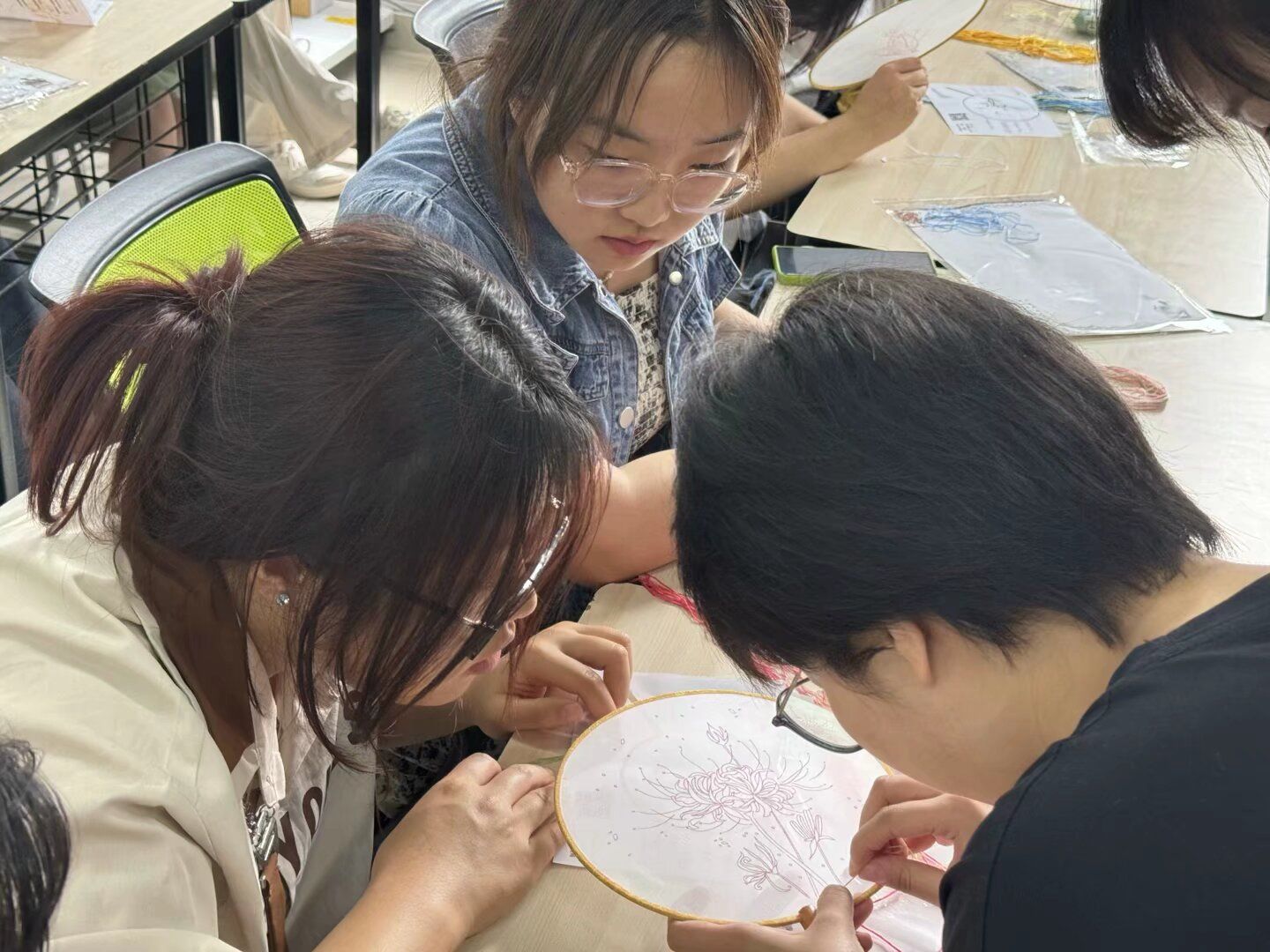 同学们全神贯注地学习刺绣的场景。他们手持针线,小心翼翼地穿针引线,每一个动作都充满了对传统艺术的尊重和热爱。同学们在老师的指导下,完成了自己的第一幅刺绣作品后,脸上露出了欣喜的笑容。