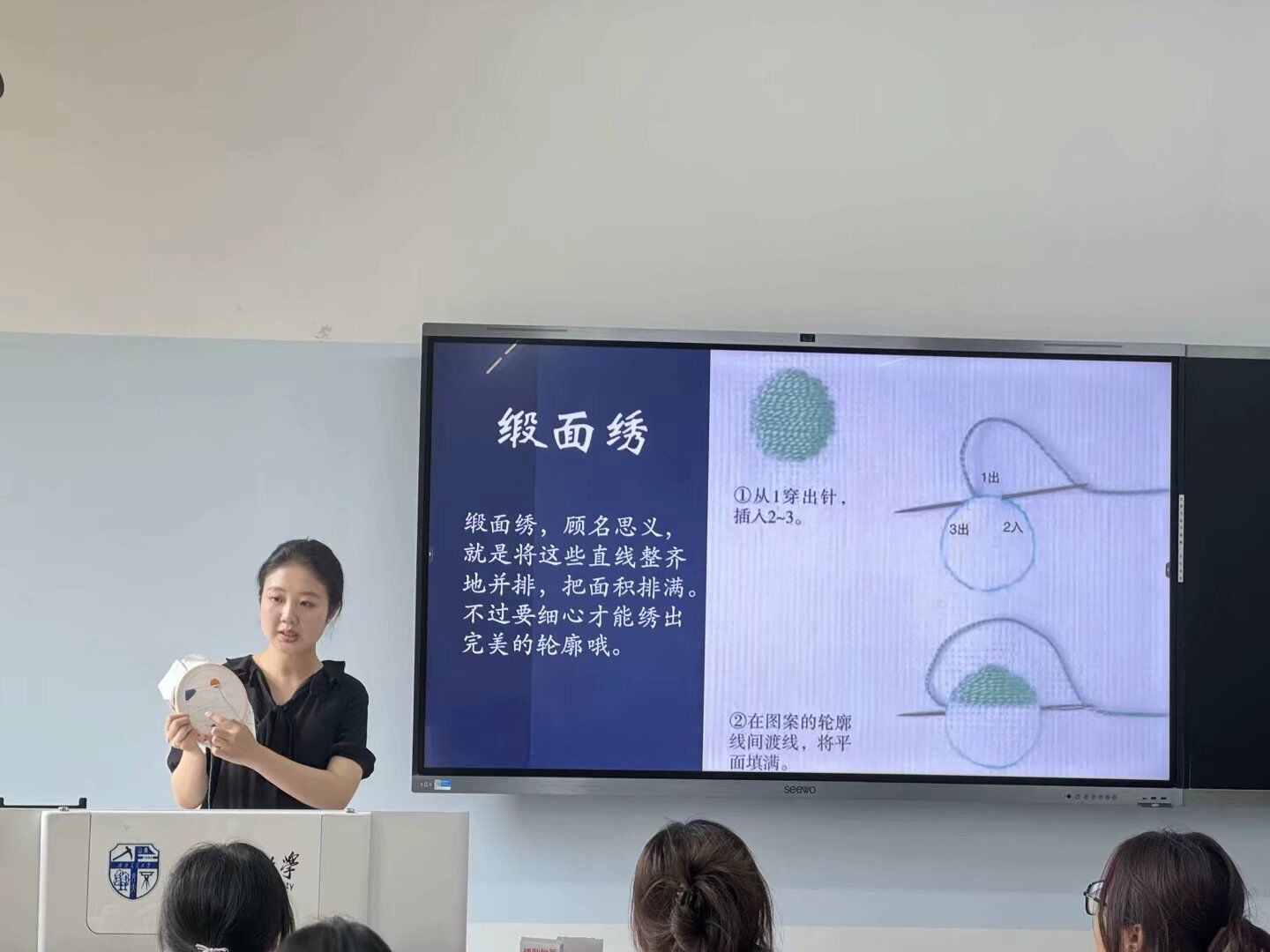 辅导员李雯、李阳阳、柯妍三位老师作为活动嘉宾。杨颖钊老师以蜀绣为例,让活动现场的学生们更直观地了解和学习刺绣技巧。通过让学生亲自体验刺绣的方法,进一步增强了学生的文化自信,丰富了学生的校园文化生活。