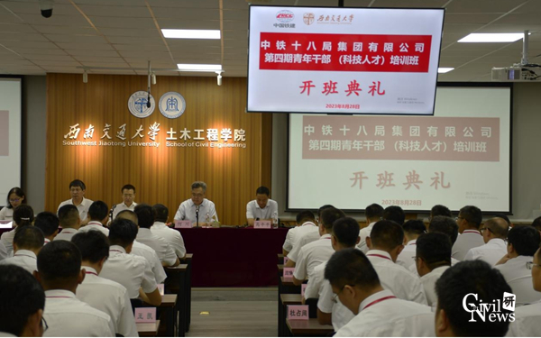2023年8月28号上午八点,中铁十八局集团有限公司第四期青年干部(科技人才)培训班开班典礼在九里校区土木馆1234教室顺利举行。