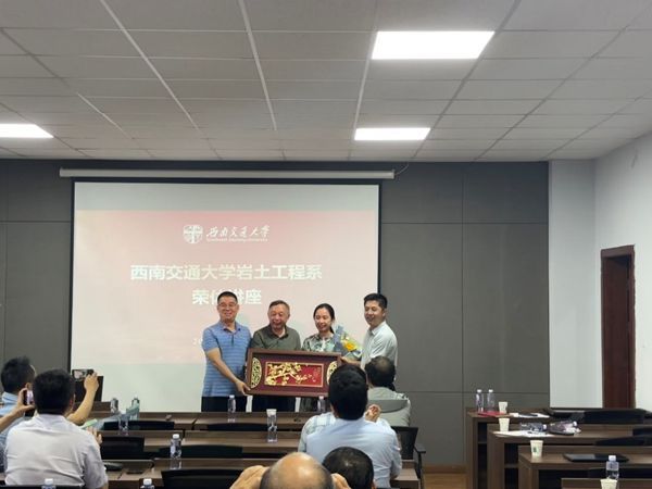 随后,张建经教授和张继春教授结合各自的研究经历,分别作了题为“包裹碎石桩复合地基静动性能研究”和“隧道(巷道)周边孔光面爆破的定向断裂、破碎与损伤研究”的学术报告。两位教授的报告集各自多年研究精华,内容丰富,学术价值高,引发全系师生对相关研究的深入思考,也被他们身上的科学精神打动。报告深入浅出、风趣轻松,为岩土系全体师生今后的学习和研究指明了方向。报告结束后,张迎宾教授、杨涛教授、教师代表魏星老师和袁冉老师为两位教授敬献鲜花并赠送纪念品,祝福他们福寿安康,笑颜永驻。张建经教授和张继春教授对系室组织本次活动表示感谢,他们回顾了多年以来与各位老师相处的点滴细节,感谢多年来大家对自己工作的支持、帮助和理解,希望青年教师和年轻学子将交大岩土精神薪火相传,为复兴交大岩土贡献力量。