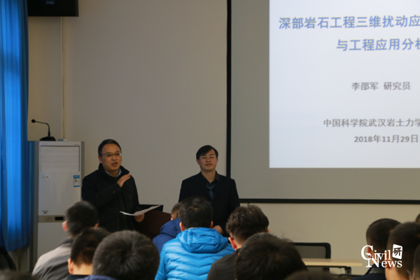 最后李邵军研究员对自己所讲的内容进行了总结,并对今后的工作进行了展望。提问环节中,李邵军研究员和在场的师生对岩石力学领域的理论和技术进行了深入的交流和讨论。在场的同学们通过本次讲座对深部工程有了基本的认识,同时也了解了扰动应力的测试技术,受益匪浅。至此,本次学术讲座圆满结束,现场师生再次为李邵军研究员送上了热烈的掌声。