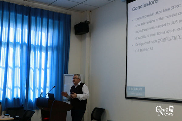进行学术交流表示热烈欢迎。在简单的自我介绍后,Colin Eddie教授直入主题,先是简要介绍了纤维混凝土,并介绍了英国的隧道设计方法和钢纤维混凝土在世界范围的应用,尤其讲解了从1994年到2018年钢纤维混凝土的设计理论及方法的变化。