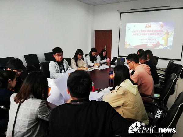 11月1日下午16:00,土木学工组党支部在4312会议室开展“认真学习贯彻全国教育大会精神为学校改革建设发展凝心聚力”主题党日活动。会议主要观看学习了全国教育大会相关解读视频,并研读了教育部部长陈宝生《认真学习贯彻全国教育大会精神 开启加快教育现代化建设、建设教育强国新征程》全文,以及人民日报发表的《经由美育抵达精神高地(美育)》一文(作者韩毓海)。
