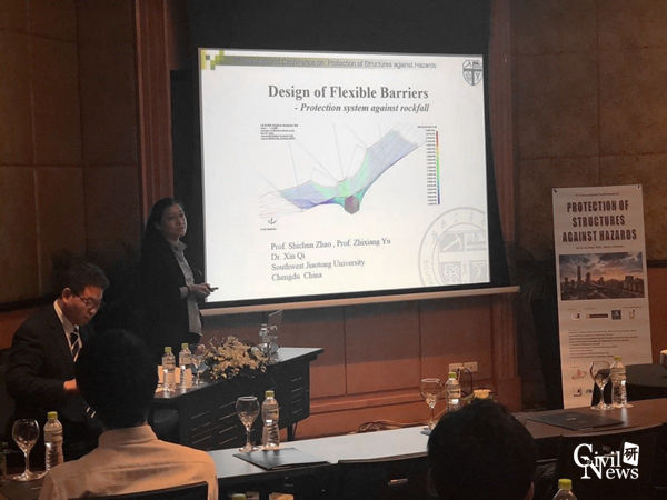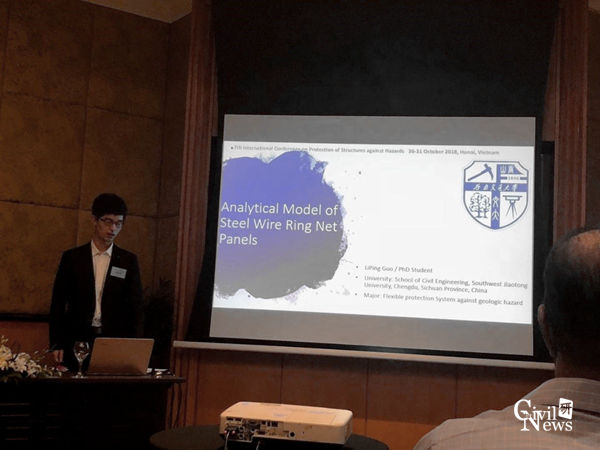 近年来在柔性防护结构设计理论研究方面取得的研究成果“Design of Flexible Barriers- Protection system against rockfall”;防护结构研究中心郭立平博士生就柔性拦截网片的解析力学模型构建 “Analytical method for out-of-plane mechanical behavior of steel wire ring net panels”做了分会场报告。