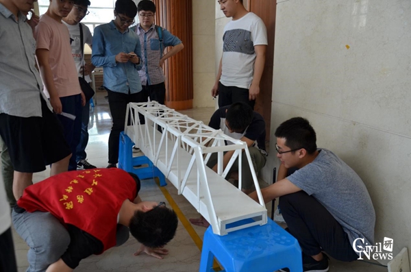 在主持人单雨的宣布下,比赛正式开始,选手们一个个忐忑的抬着自己的模型进入加载台,每组由一位同学进行时长4分钟的PPT答辩,每组都为老师准备了各自的计算书,供老师查阅作为评分依据。加载分为预加载,第一次加载和第二次加载,一次比一次难度更大,更让人紧张不已。由于赛题较难,在前面几组加载中未有一组通过了预加载,模型均不同程度损坏,评审老师就桥梁结构形式,损坏原因向大家进行讲解。但大家任然心中充满忐忑,场面一度十分焦灼,但是接下来随着一些制作精美,力学计算严谨的参赛作品被搬上加载台,一个个记录被渐渐打破,台下传来惊叹而又崇敬的掌声和欢呼声。现场气氛热烈,每一组上台,大家都捏一把汗,大家不再是只关注自己的作品,也为他人加油鼓气,不足之处互相交流经验,在这愉快的交流学习中,增进了友谊,学到了经验。在愉快的氛围中,比赛圆满结束。