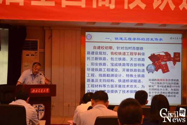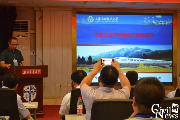 副院长王旭教授做了以“铁道工程专业现场实验室建设”为题的报告,介绍了兰州交通大学铁道工程专业的历史传承、现状以及铁道工程实践基地的建设。
