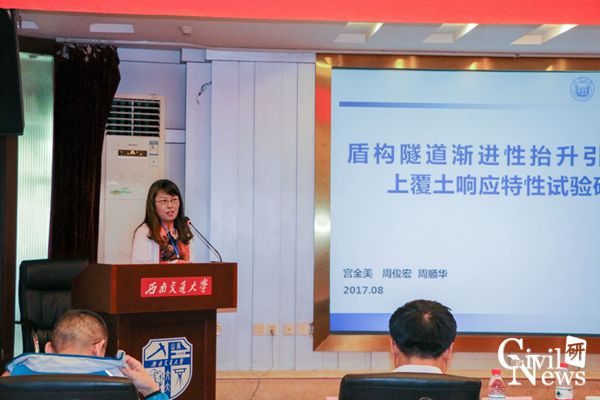来自同济大学城市轨道与铁道工程系的宫全美教授,介绍了她的团队在盾构隧道渐进性抬升作用下上覆土压力方面的研究。为了直观、准确地研究该情况下的土压力,宫老师团队配成了透明的软土相似模型材料,并通过激光照射,将土体的剪切面直观地反应出来,为土压力的计算提供了参考依据。