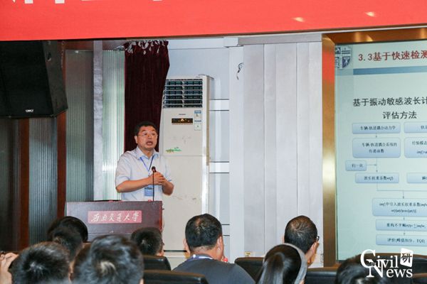 肖军华教授来自同济大学城市轨道与铁道工程系,他的研究报告着眼于铁路下土体的应力动态演化规律,提出在往复荷载(低频)作用下,土单元主应力轴会旋转,并由此对整个路基产生影响。随后肖教授介绍了路基填料的动力响应、路基的长期稳定性和路基—有砟轨道层状结构体系作用机制方面的研究成果。我国的铁路网依然存在大量的低速线路,肖教授的研究对于既有低速线路路基的养护具有现实意义。