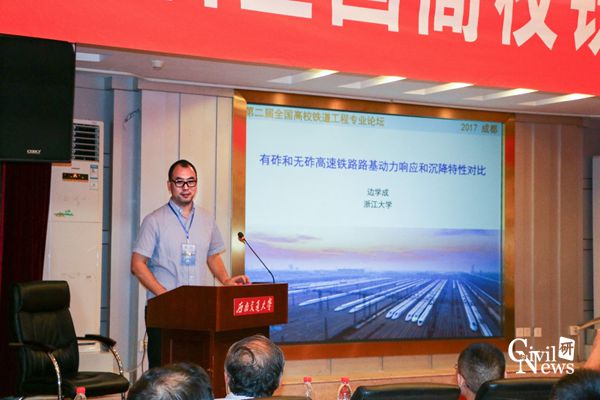最后一位汇报的专家是来自浙江大学的边学成教授。他的报告从对有砟轨道和无砟轨道的对比开始,通过模型实验对比有咋轨道和无砟轨道的动力响应特征和沉降特征。