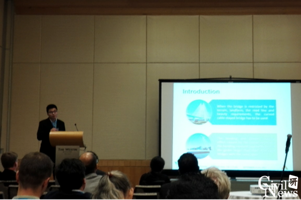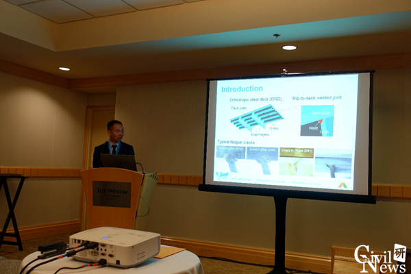与会代表共做了4场学术报告:博士生周筱航做了题为《Modal parameter identification of a curved cable-stayed model bridge based on EDA and DATA-SSI》的报告;博士生张二华做了题为《Influence of curvature radius on static and dynamic characteristics of curved cable-stayed bridge》的报告;博士生程震宇做了题为《Optimal design and fatigue performances of innovative corrugated orthotropic steel deck plate-RPC layer composite deck structure》的报告;博士生罗鹏军做了题为《Fatigue evaluation and parametric study on orthotropic steel deck composed of a new-type of U-rib with upset webs》的报告。报告介绍了桥梁工程系在健康监测和高性能结构桥梁方面的最新研究进行,引起了国内外同行的浓厚兴趣,取得的成果获得了国内外同行的好评。