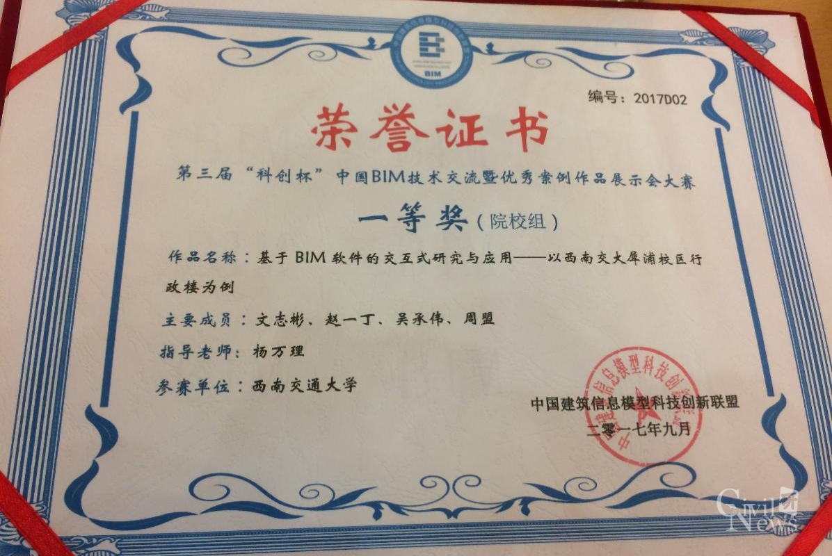 参赛作品《基于BIM软件的交互式研究与应用—以西南交大犀浦校区行政楼为例》脱颖而出,荣获大赛一等奖。