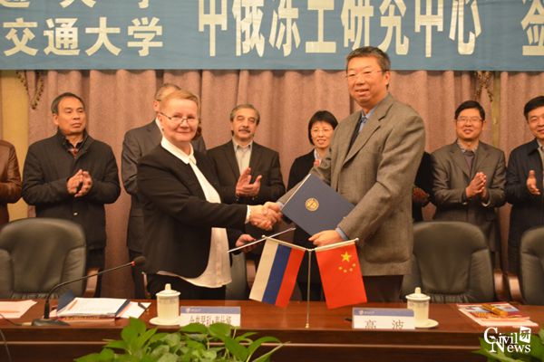 高波院长与莫斯科国立交通大学轨道、建筑、结构研究院舍普琴科·泰什娅院长于镜湖宾馆若愚厅共同签署了关于双方联合成立“中俄冻土研究中心”的协议,并举行了揭牌仪式。仪式由色情短剧