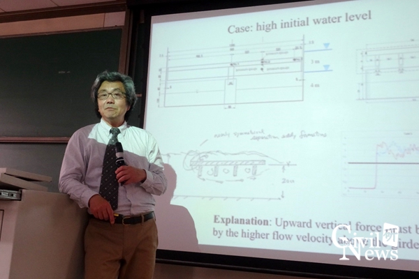 讲座开始时,Yeh教授先向同学们展示了一段他曾经在现场拍摄的海啸侵袭海岸结构物的视频,让同学们对真实海啸的破坏力有了更直观的认识。紧接着Yeh教授正式开始此次讲座,讲座主要包括以下几个方面,第一结合大量现场实例展示了2011年东日本海啸中的桥梁破坏形式,为同学们展示了许多珍贵的现场资料;第二向大家介绍了在日本土木研究所(PWRI)开展的相关试验,对桥梁不同类型上部结构受到的海啸作用力及破坏机理进行的研究及相关成果;第三为大家介绍了在华盛顿大学开展的桥梁下部结构(桥墩)海啸力试验,对基于光滑粒子流体动力学的数值模型进行检验,介绍不同流动条件下桥墩海啸力的数值计算,以及对目前海啸力数值计算中所存在问题的研究和讨论;最后向同学们介绍了近期研究成果:深水桥梁地震时桥墩动水压力产生的基本原理及计算方法。