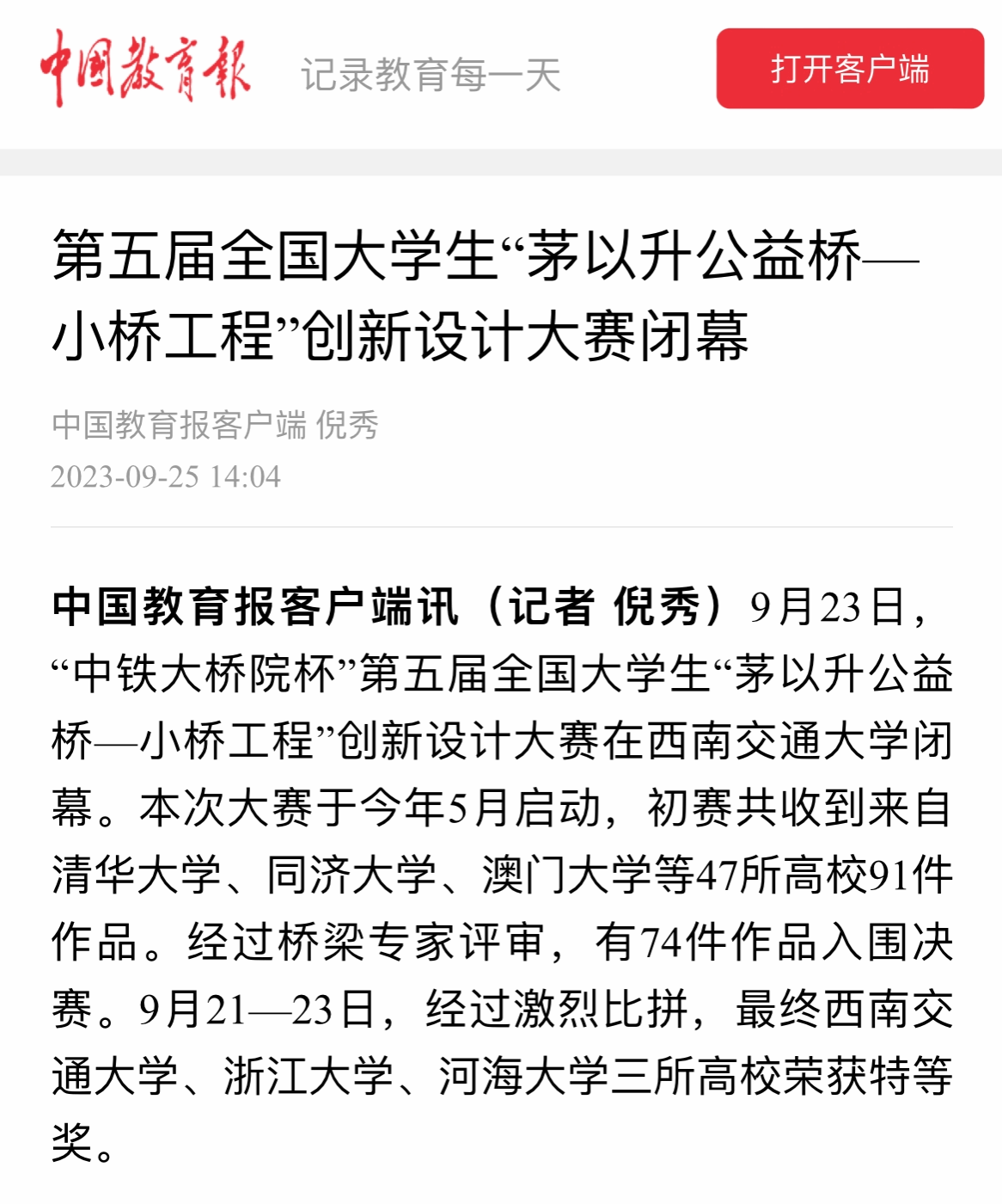 5. 【中国教育报】第五届全国大学生“茅以升公益桥—小桥工程”创新设计大赛闭幕
