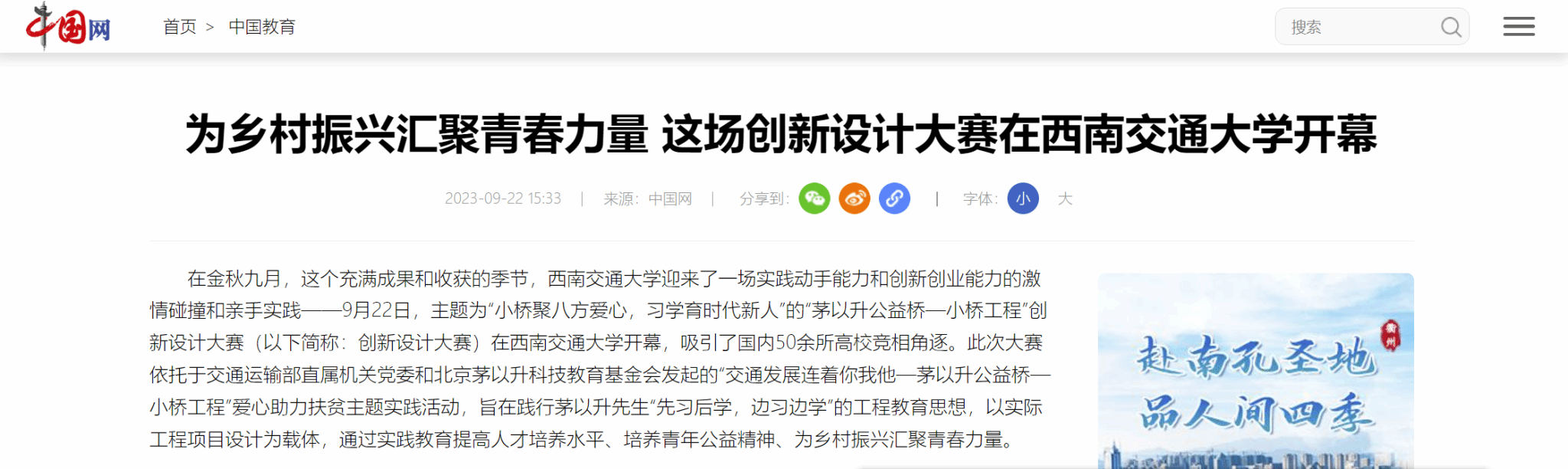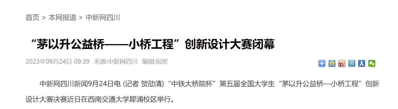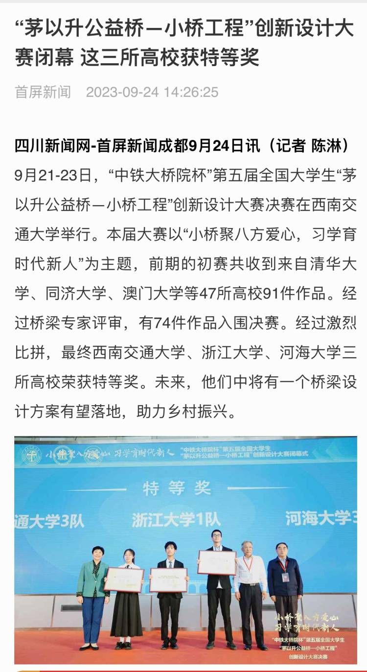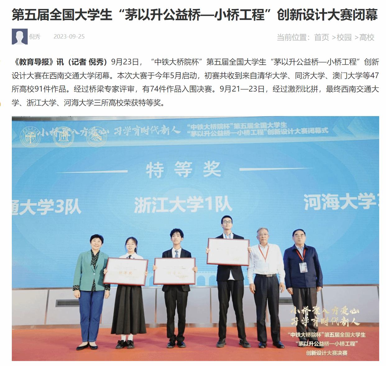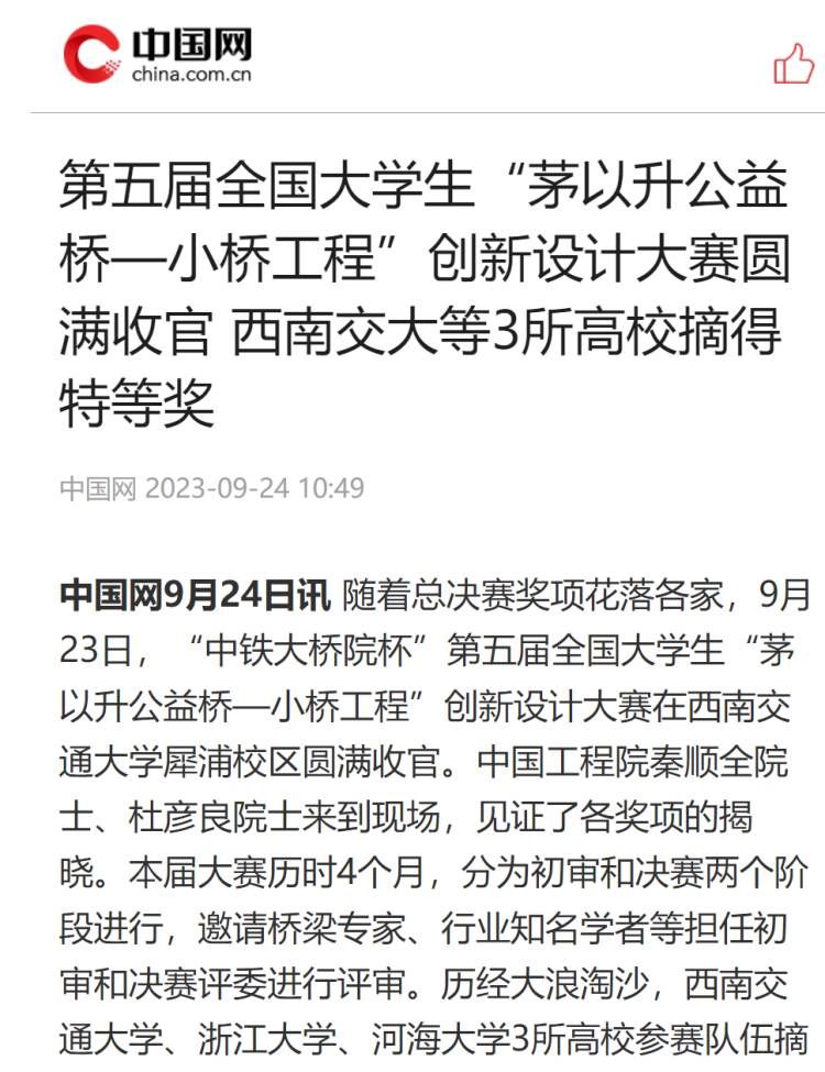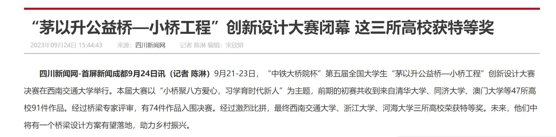 2. 【中国网】第五届全国大学生“茅以升公益桥—小桥工程”创新设计大赛圆满收官 西南交大等3所高校摘得特等奖