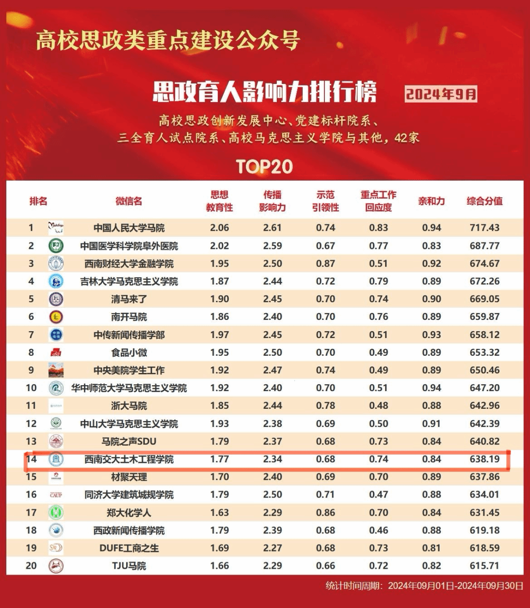 为充分发挥新媒体平台对高校思想政治工作的促进作用,推动高校公众号成为思政教育有效载体,促进各重点建设公众号提升内容质量,发挥示范作用,高校思政类公众号重点建设项目组从思想教育性、传播影响力、示范引领性、重点工作回应度、亲和力五个维度,每月对首批200个高校思政类重点建设公众号开展育人影响力综合评价,分类别发布“思政育人影响力排行榜”和“思政育人影响力提升榜”。