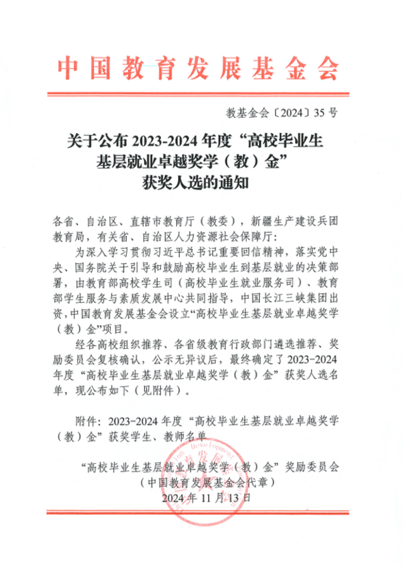 “高校毕业生基层就业卓越奖学金”由教育部高校学生司(高校毕业生就业服务司)、教育部学生服务与素质发展中心共同指导,中国长江三峡集团有限公司出资,中国教育发展基金会特设,旨在深入学习习近平总书记重要回信精神,贯彻落实党中央、国务院关于引导和鼓励高校毕业生到基层就业的决策部署,奖励赴基层就业创业并做出突出业绩的普通高校毕业生。2024年,全国共有398名优秀高校毕业生获得奖励。此次色情短剧
