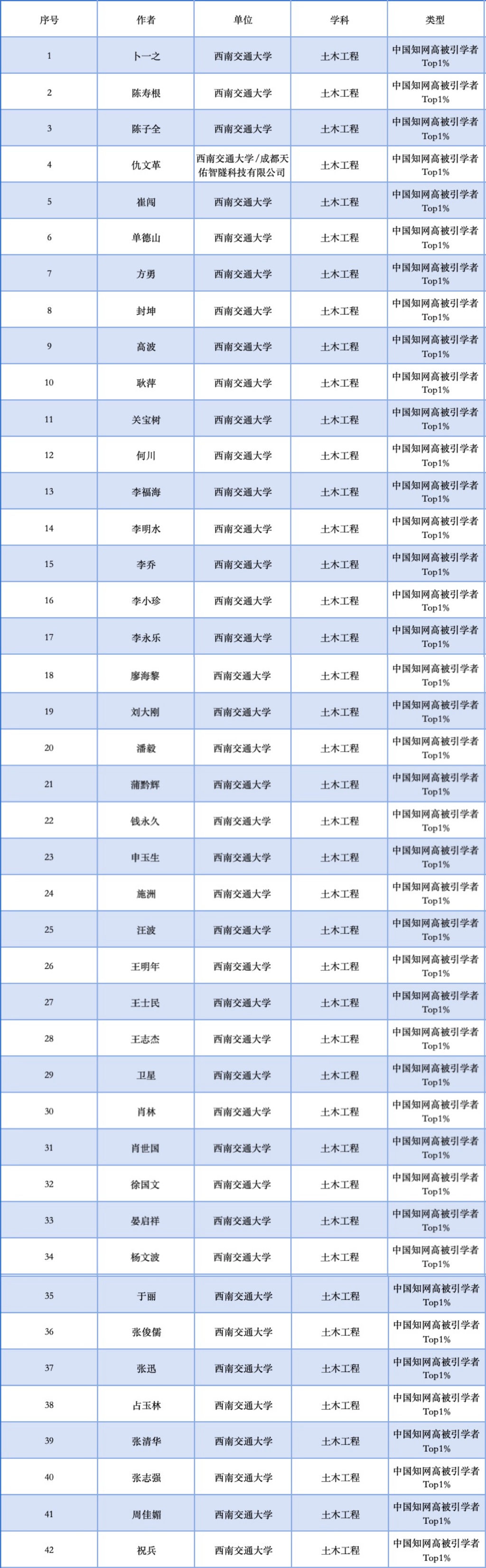 42名学者入选2024年度中国知网土木工程学科高被引学者Top1%。