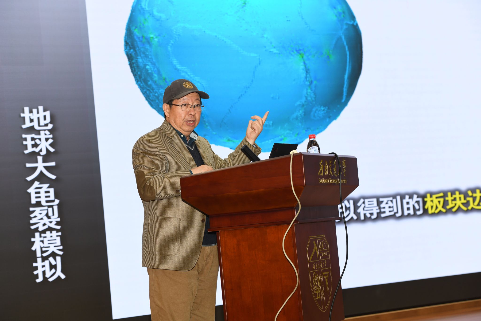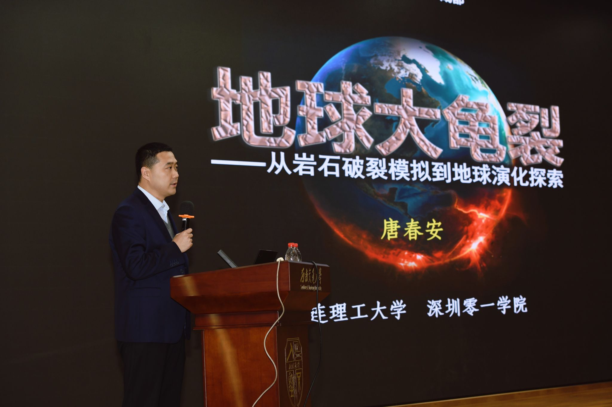 讲座中,唐春安教授基于热力学、物理学和力学的基本原理,从龟裂的形成机理入手,详细阐述了“地球大龟裂”理论。唐教授提到,该学说通过自主研发的地球模拟器2.0,模拟了岩石圈的破裂过程,揭示了板块起源的龟裂模式,特别是洋中脊裂谷的形成过程。他还通过建立地球系统的热平衡方程,解释了岩石圈破裂如何诱发地球冷-热波动的演化机制。