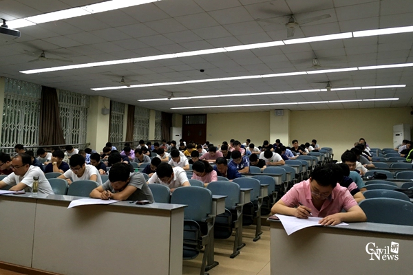 继续教育中心的老师监考,考试时间为上午8点30分到11点30分。在江富长老师宣读完考试注意事项之后,考试准时开始。考试过程中监考老师认真负责,考场纪律井然有序,经过3小时的认真作答,考生们陆续交卷离开考场,本次考试到此结束。